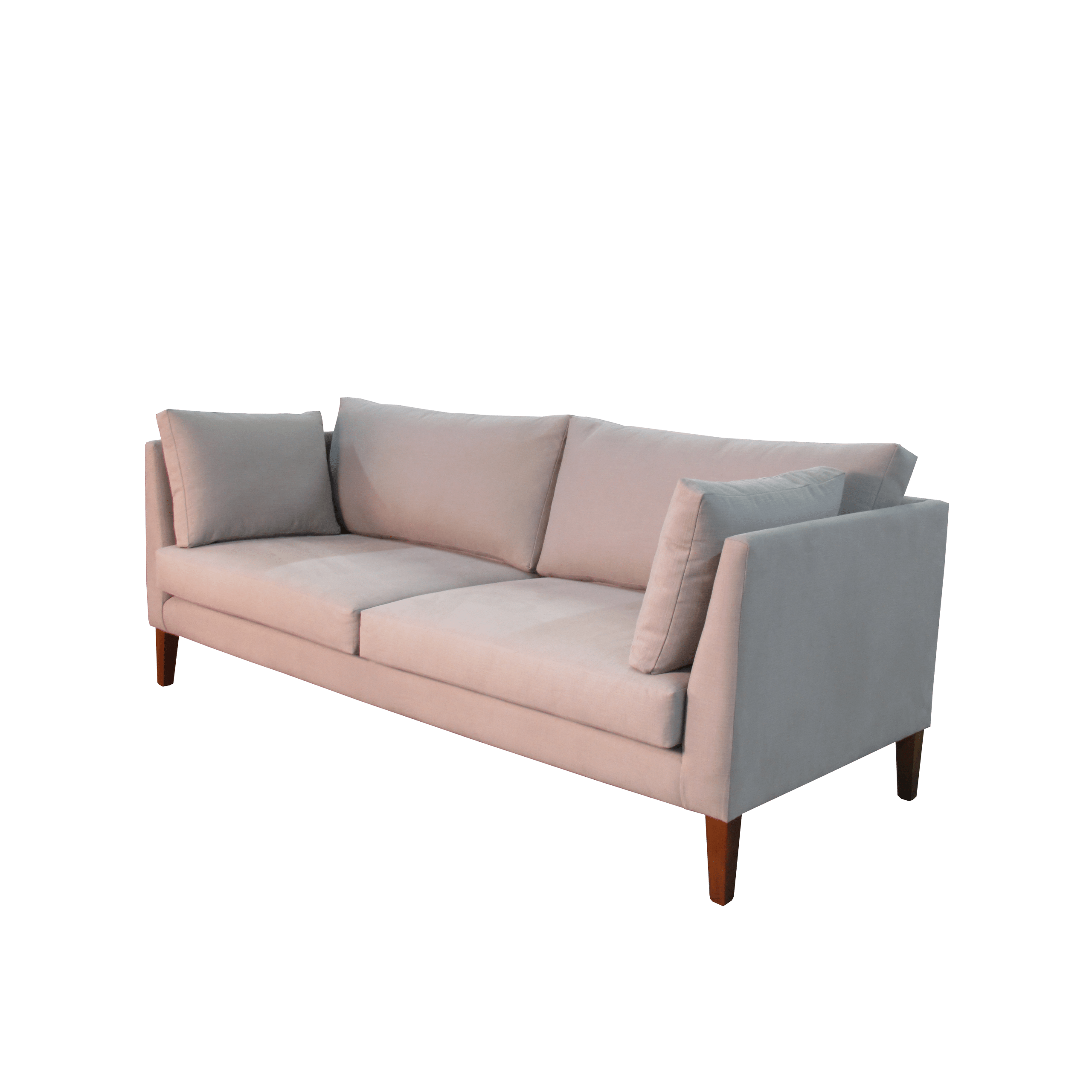 One of our bespoke designs, two seater sofa with cushioned back, seat and arms. Warm wooden legs. In a light grey fabric.
